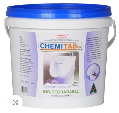 Scented Refresher Tabs: Dependable, safe and economical long term odour control for toilets. Chemitab toilet deodorant blocks (crystals) are made from 100% organic material and contain no soap or water soluble components.